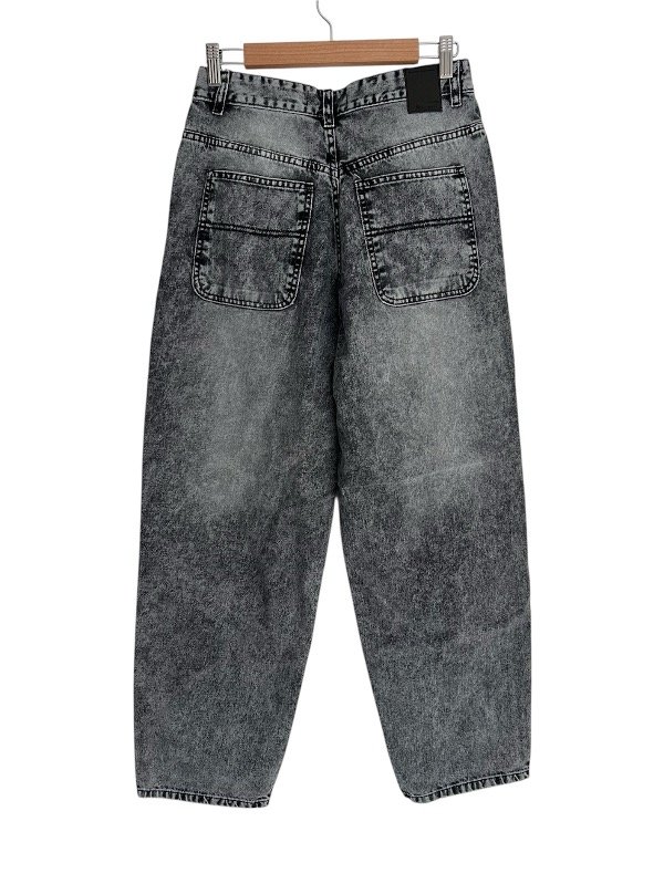 Pantalón Baggy tiro alto. Lavado nevado suavizado con localizado sectorizado y bigotes. Cierre frontal de bronce con cremallera, botón metálico.