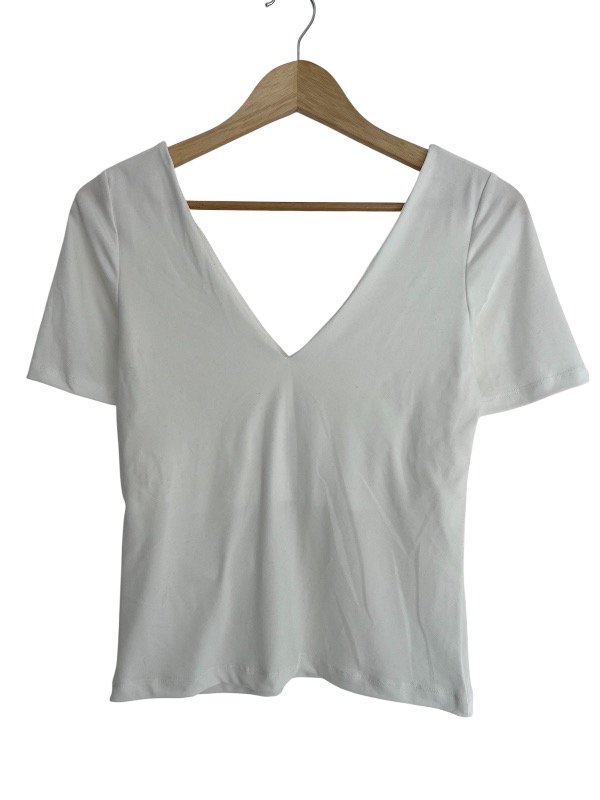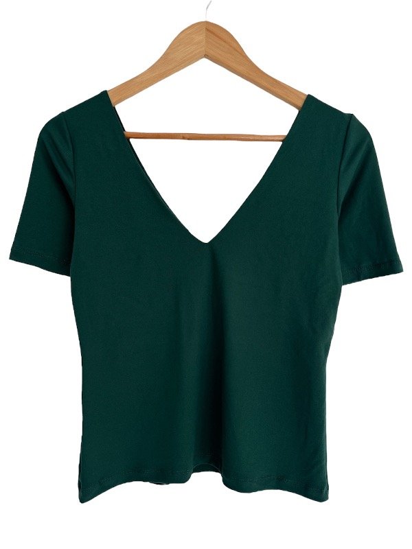 Remera mangas cortas , confeccionado en tejido elástico compuesto por viscosa ,algodón, elastano (modal soft). Tela doble en mitad superior frente y espalda . Escote V frente y espalda .TALLE L.