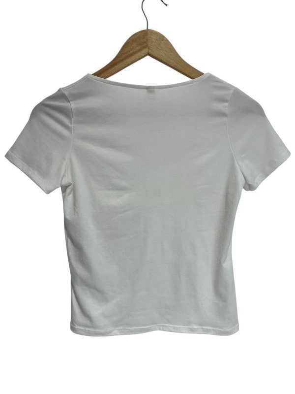 Remera mangas cortas , confeccionado en tejido elástico compuesto por viscosa ,algodón, elastano (modal soft). Tela doble en mitad superior frente. Escote espejo. TALLE M.