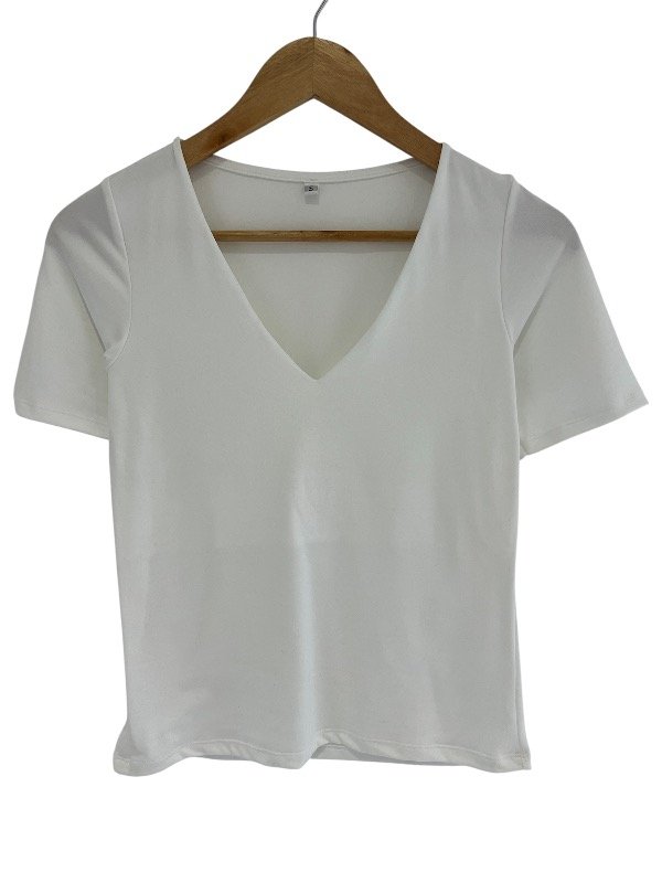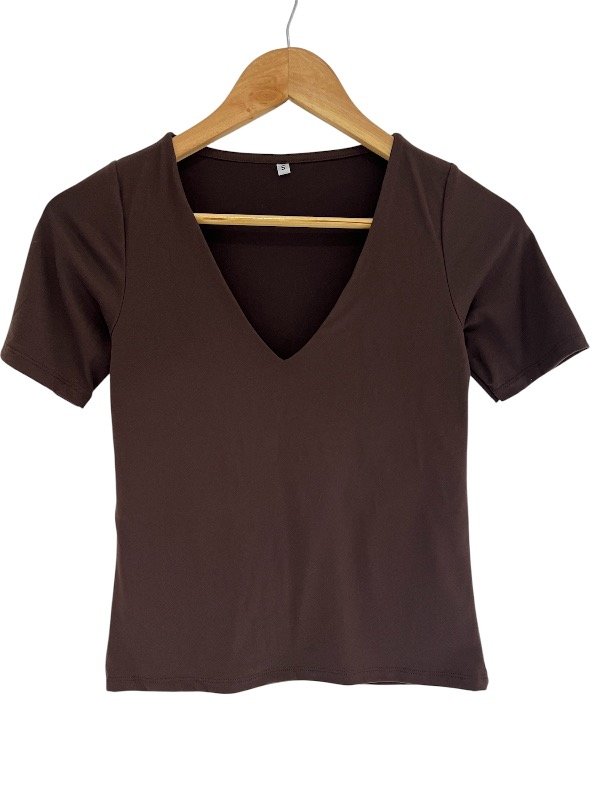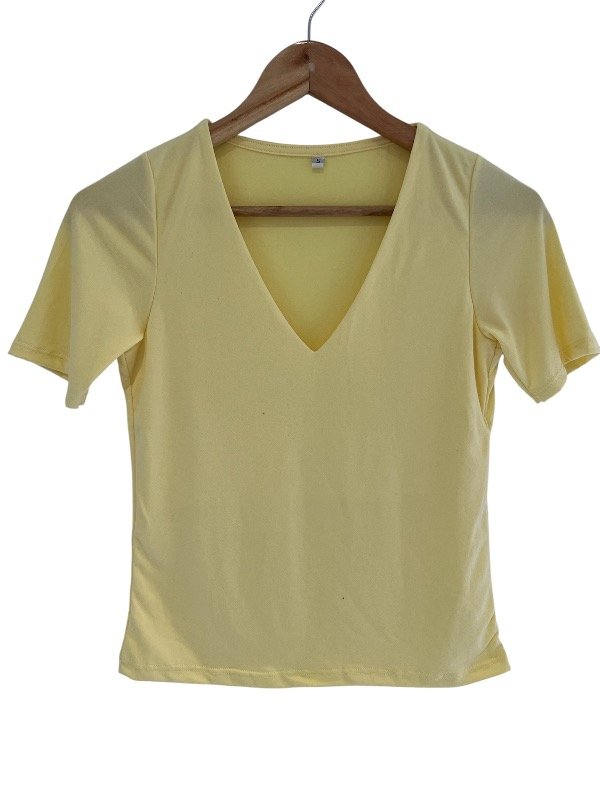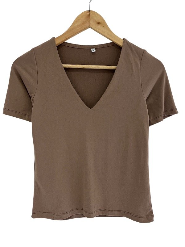 Remera mangas cortas , confeccionado en tejido elástico compuesto por viscosa ,algodón, elastano (modal soft). Tela doble en mitad superior frente. Escote V . TALLE S.